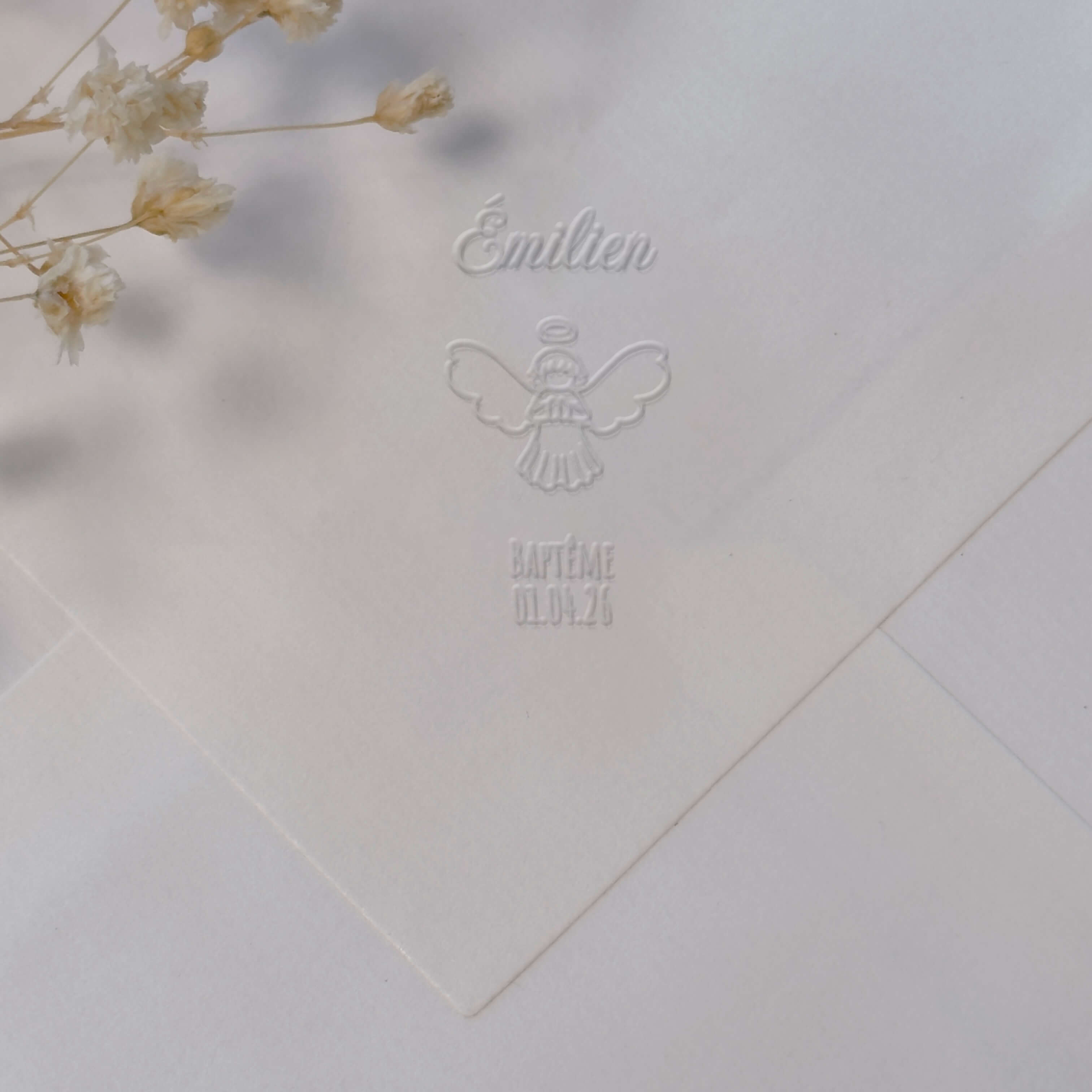 Create a unique dry imprint to celebrate baptism with this customizable template depicting a praying baby angel.