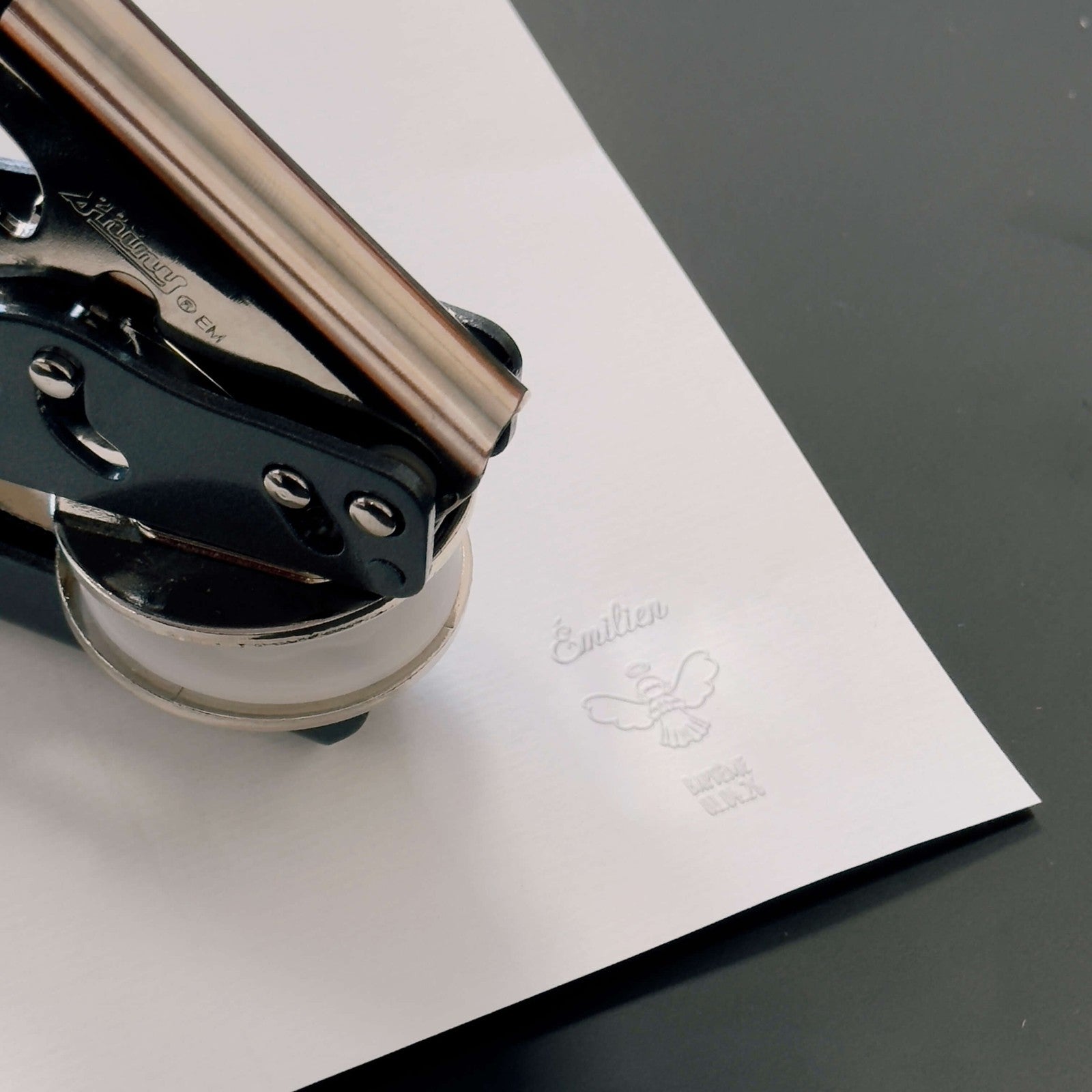 The Popstamp Grenoble workshop team includes several professional designers who will be happy to work with you on creating your custom embossing press design with unbeatable turnaround.