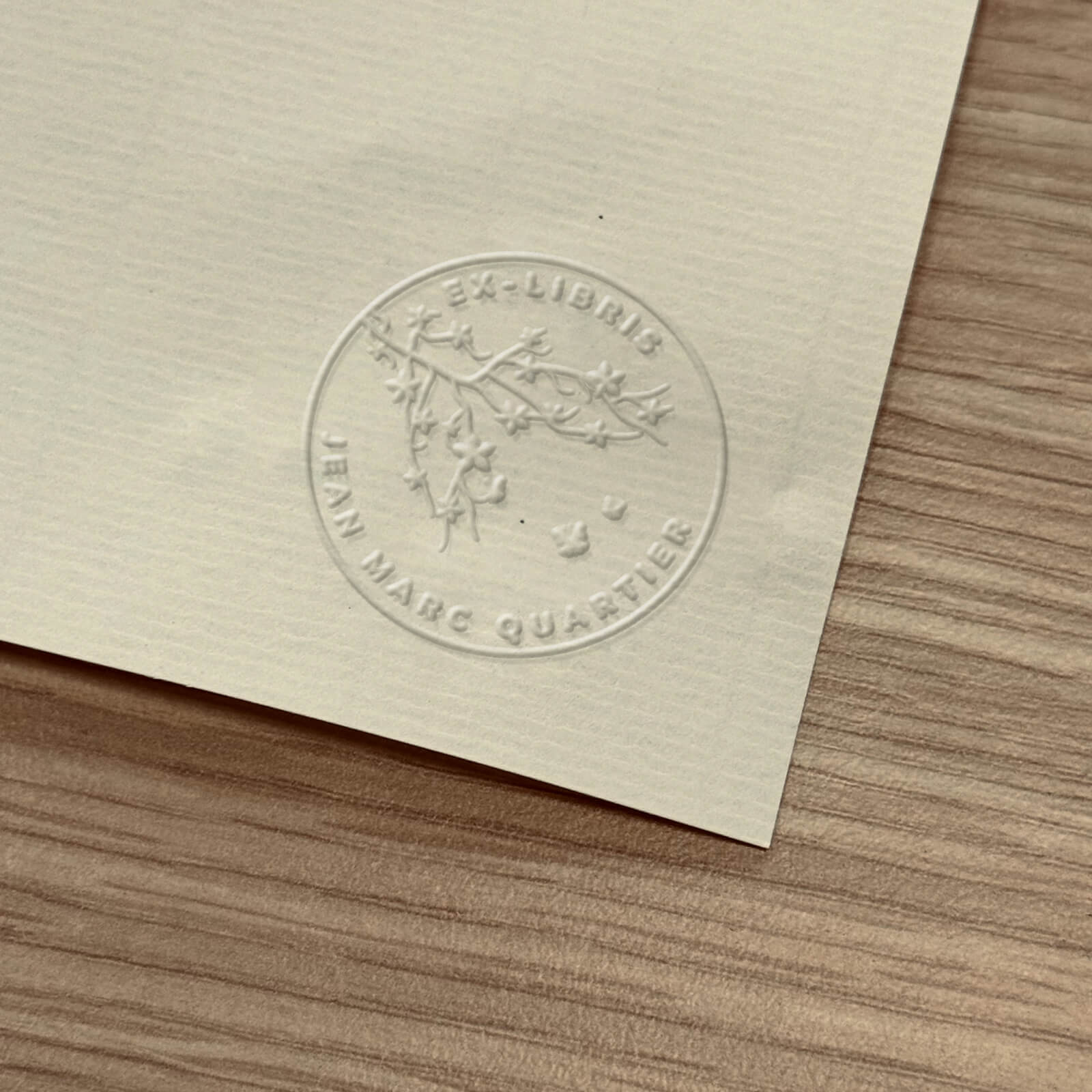 Imagine adding a unique touch to your books, cards, or correspondence with our 'Ex-libris flowering branch' embossed stamp. This design enhances any page with a delicate motif that can be personalized to your liking. The main design features a branch adorned with delicate flowers, surrounding a space for your custom text.