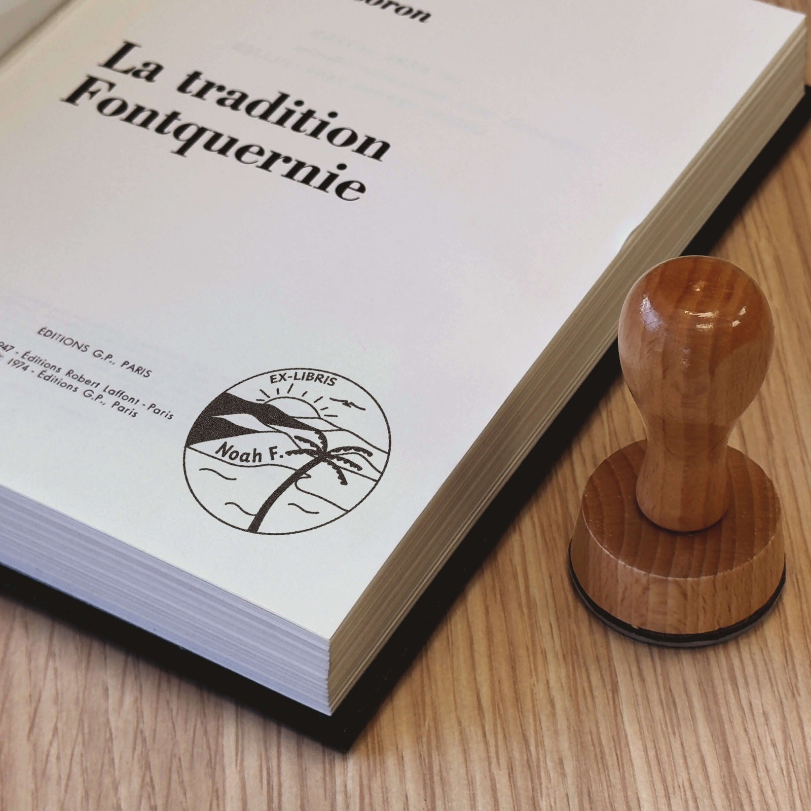 Transform your books into personalized works of art with this wooden bookplate stamp model featuring an enchanting tropical motif.