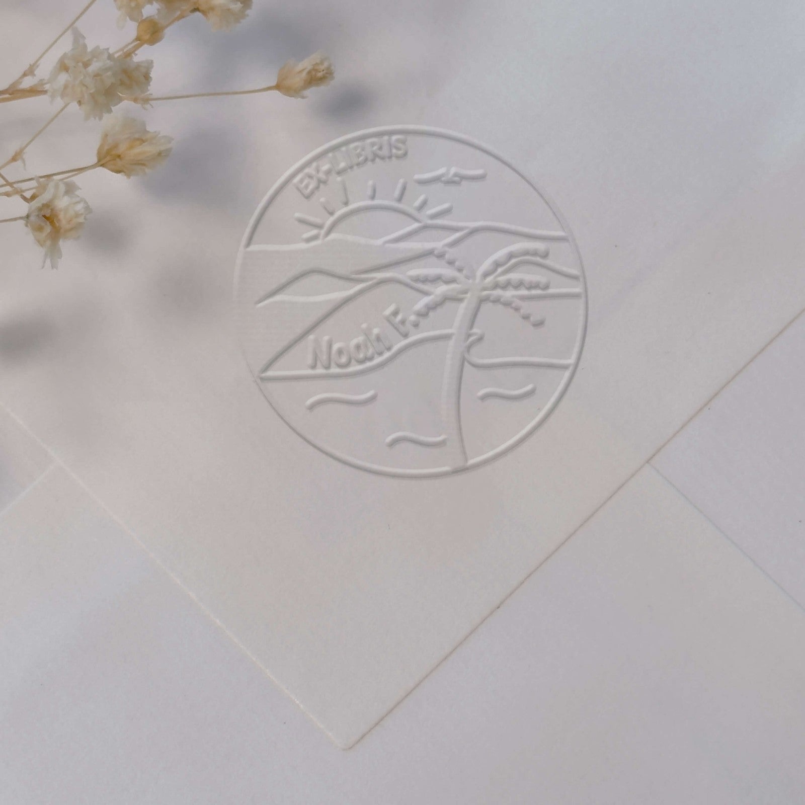 Create personalized books with this bookplate template depicting a paradisiacal oasis, perfect for marking your works with a unique dry imprint.