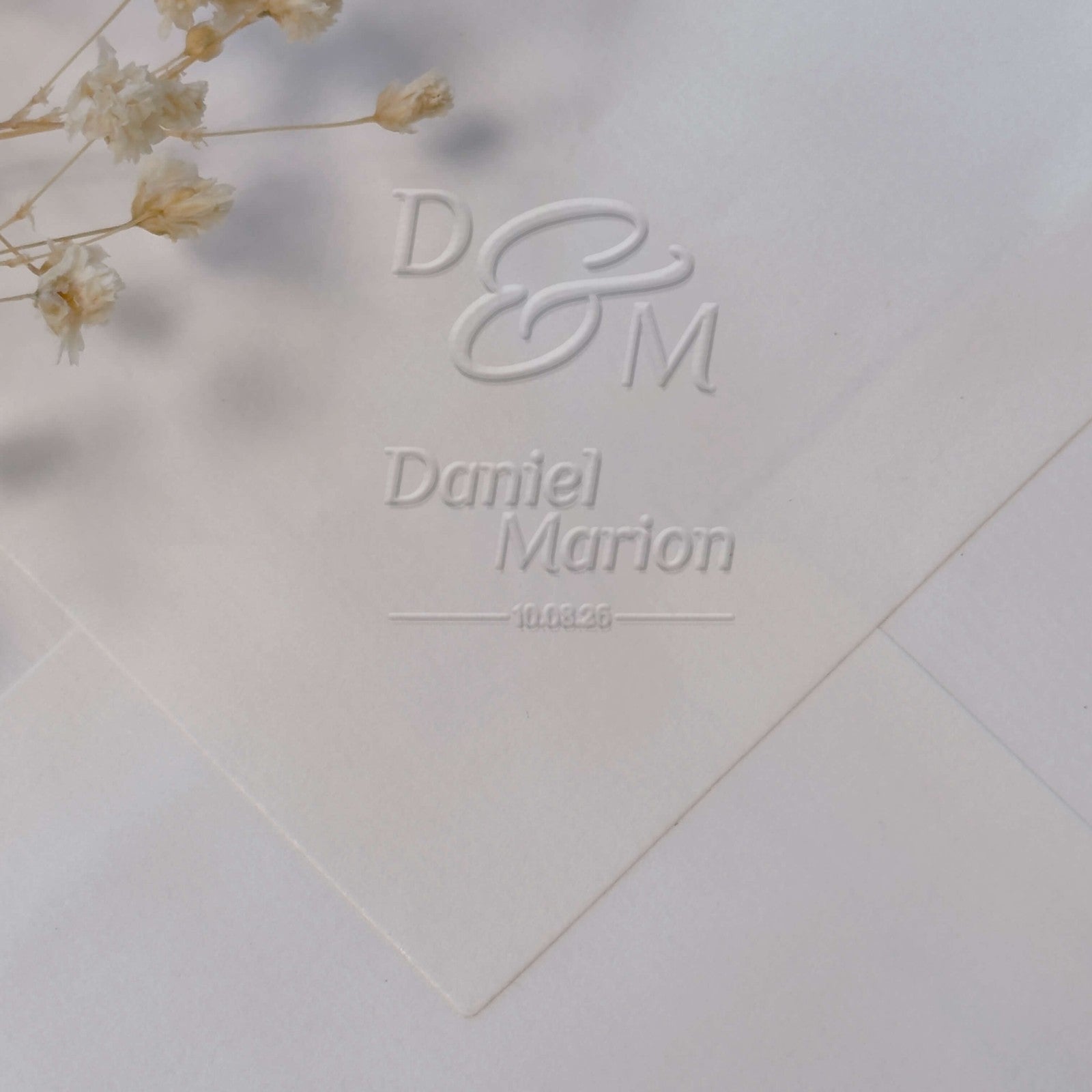 Create a unique dry imprint for your wedding with this elegant monogram design, combining your initials, names and date in a perfectly balanced square format.