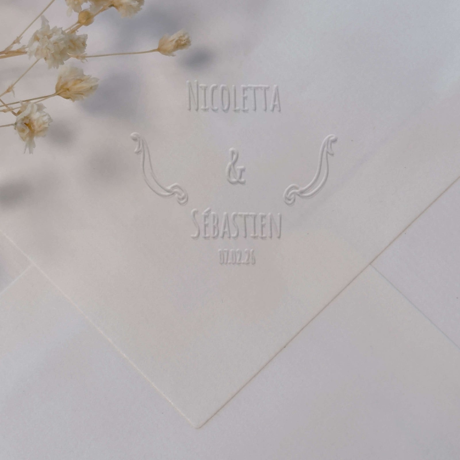 Mark your union with an elegant seal with this typographic embossing design featuring refined ribbon-like ornaments.