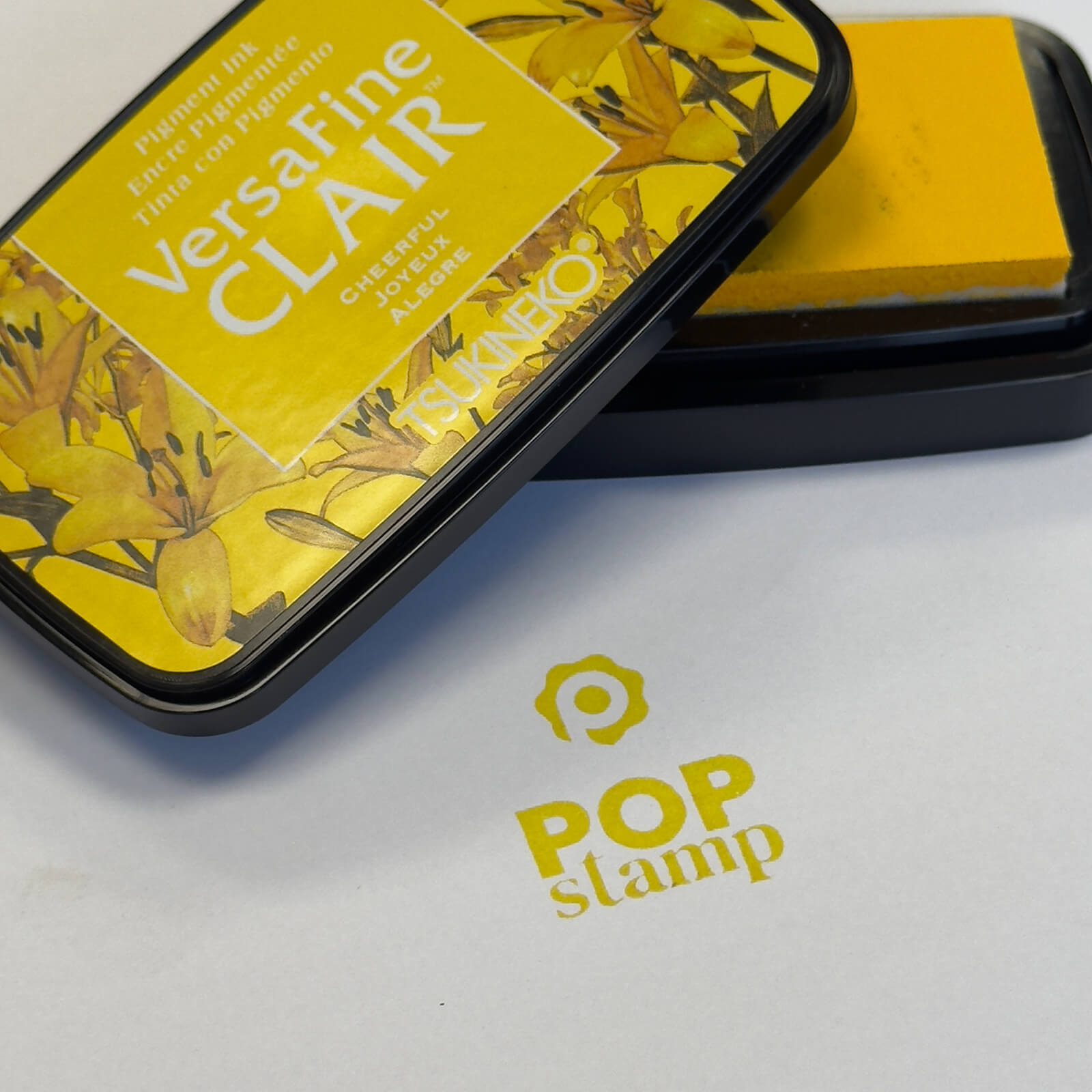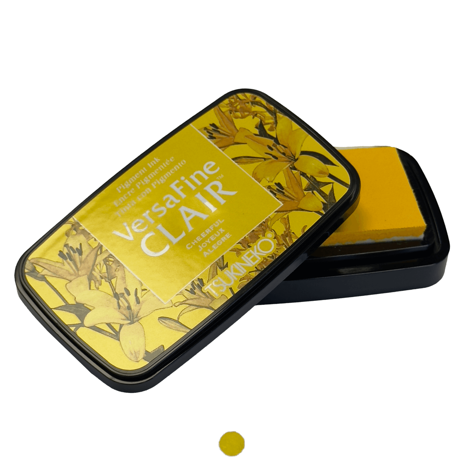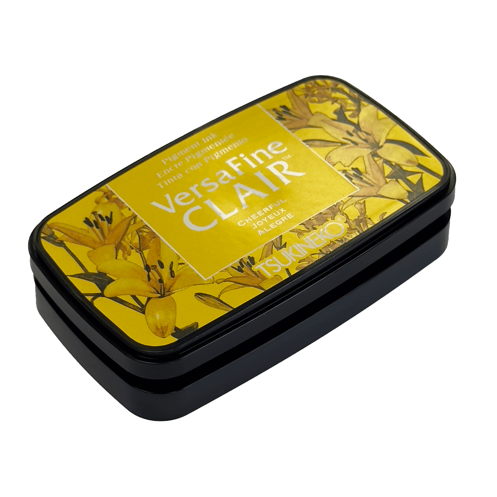 Brighten up your creations with VersaFine Clair Joyeux ink, a vibrant yellow ink in its elegant rectangular case adorned with golden lilies for precise and luminous stamping.
