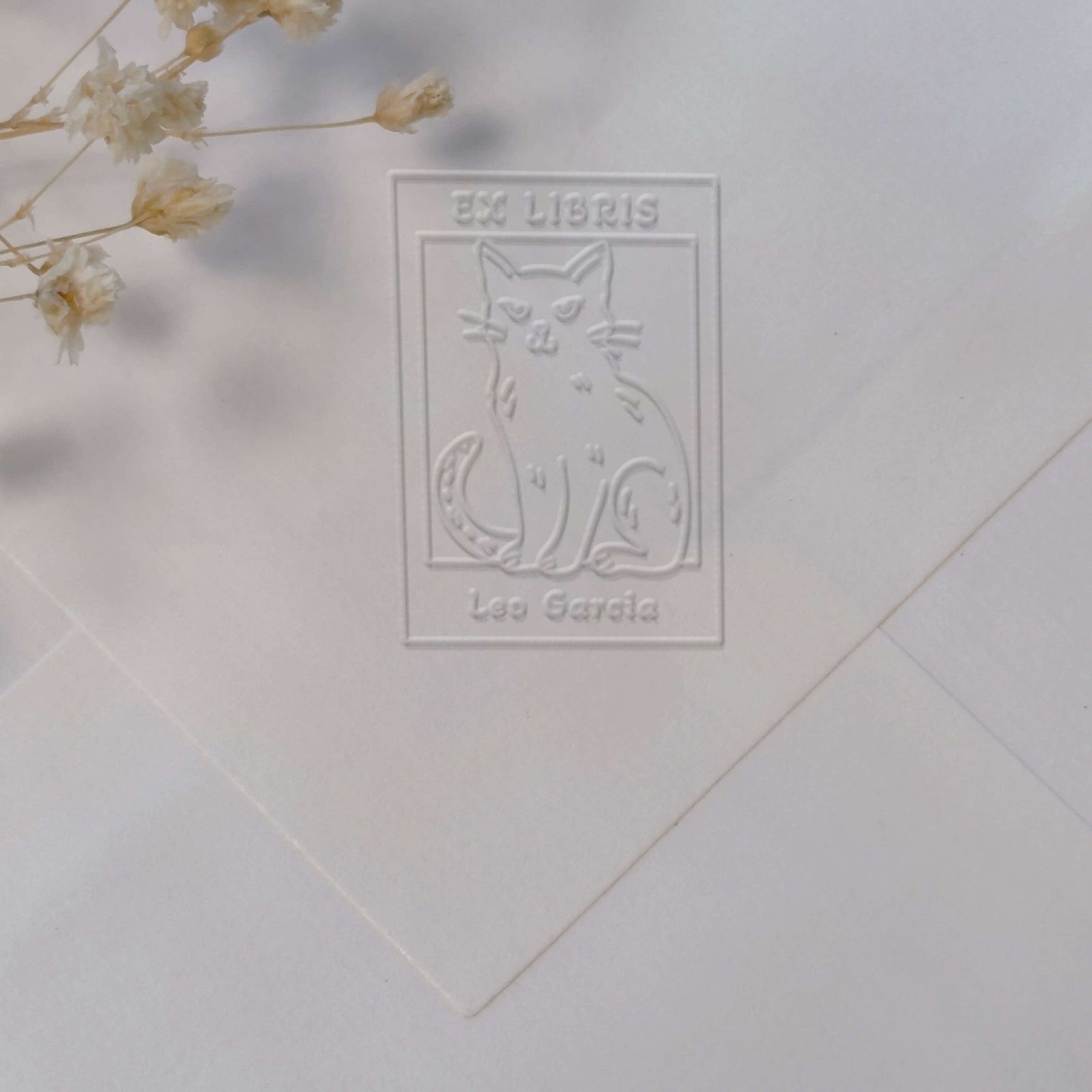 Personalize your books with this elegantly designed bookplate, featuring a cat sitting in a refined rectangular frame.