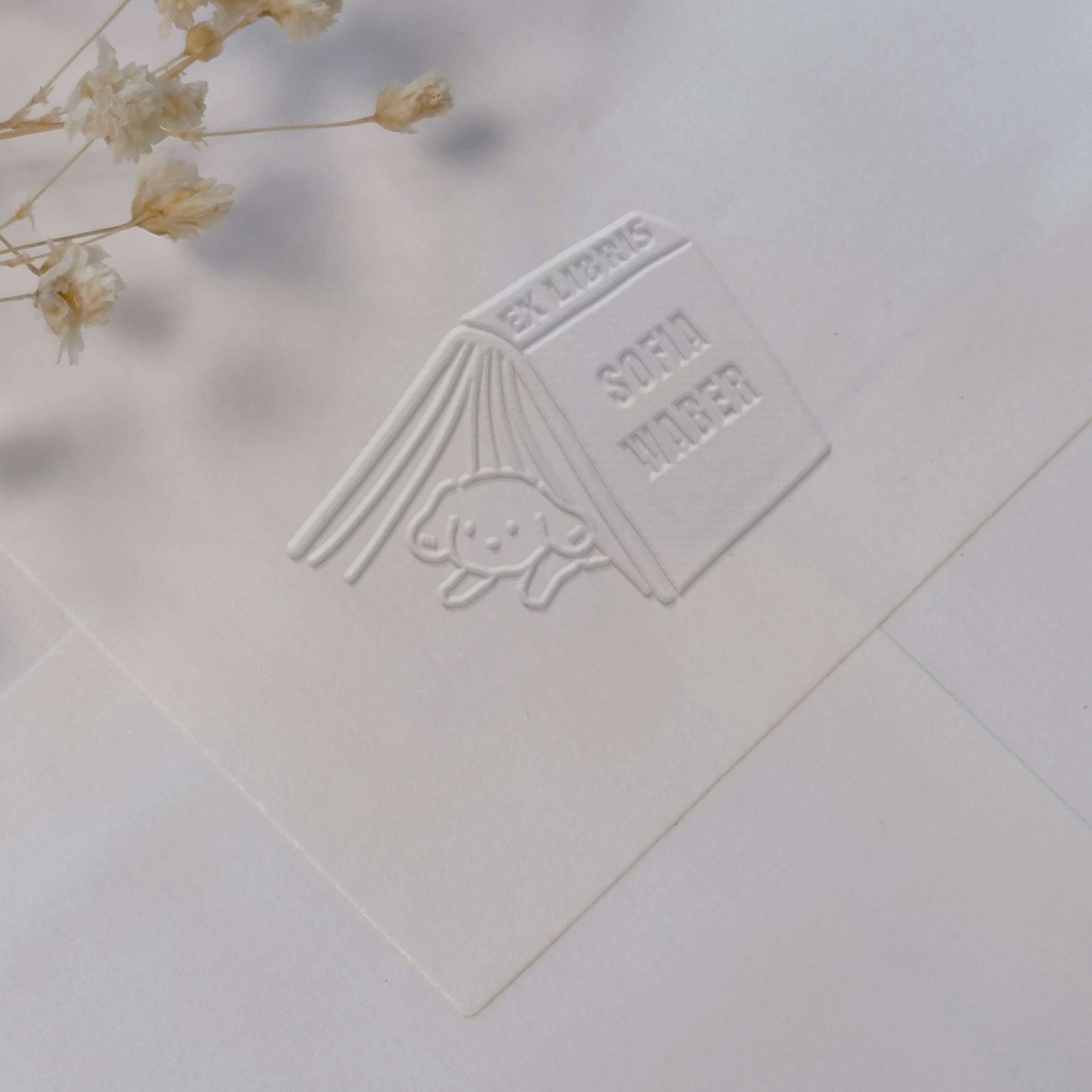 Personalize your books with elegance thanks to this charmingly designed bookplate featuring a small puppy under a half-open book.