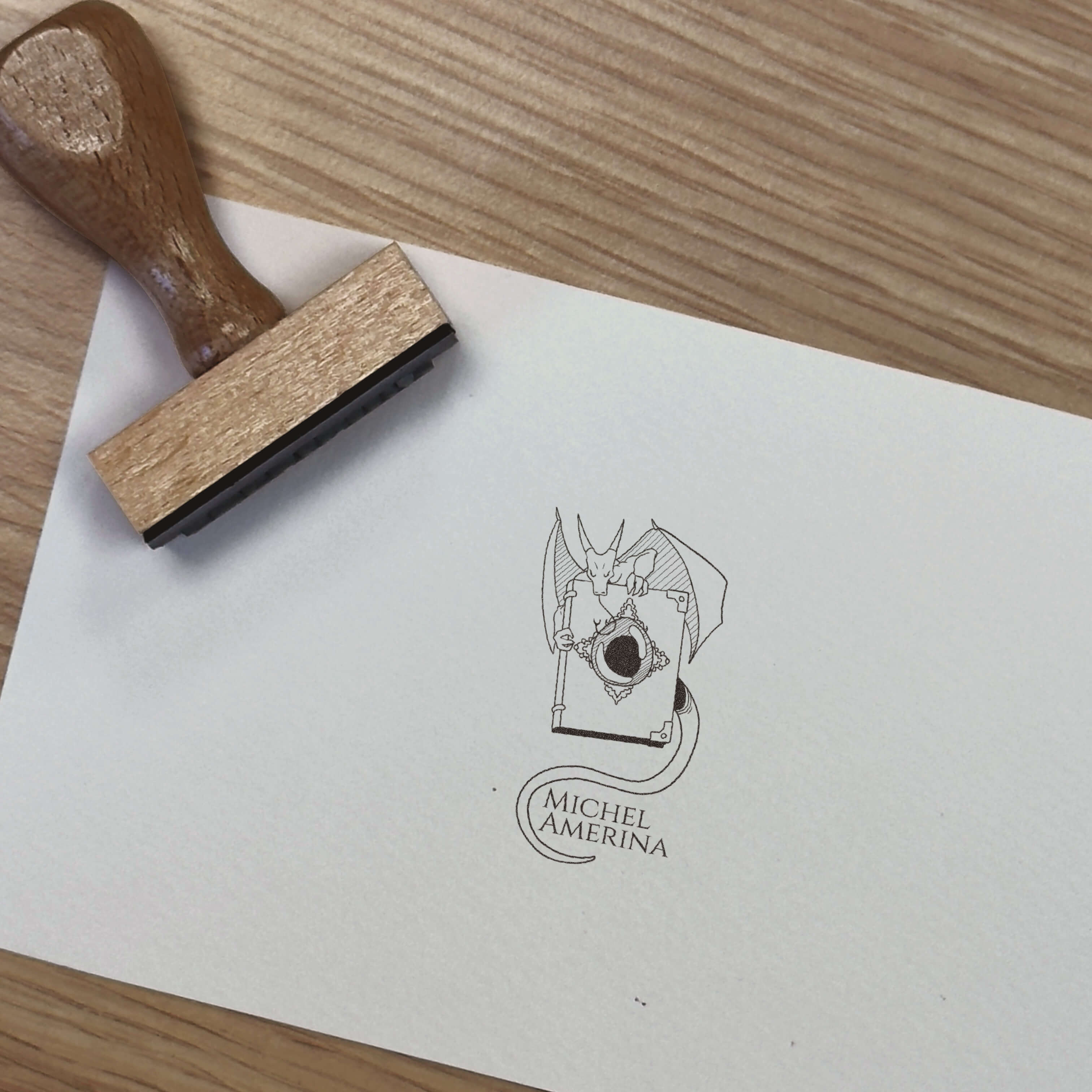 Mark your books with elegance using this ex-libris stamp with a dragon and medieval grimoire motif, customizable with your name.