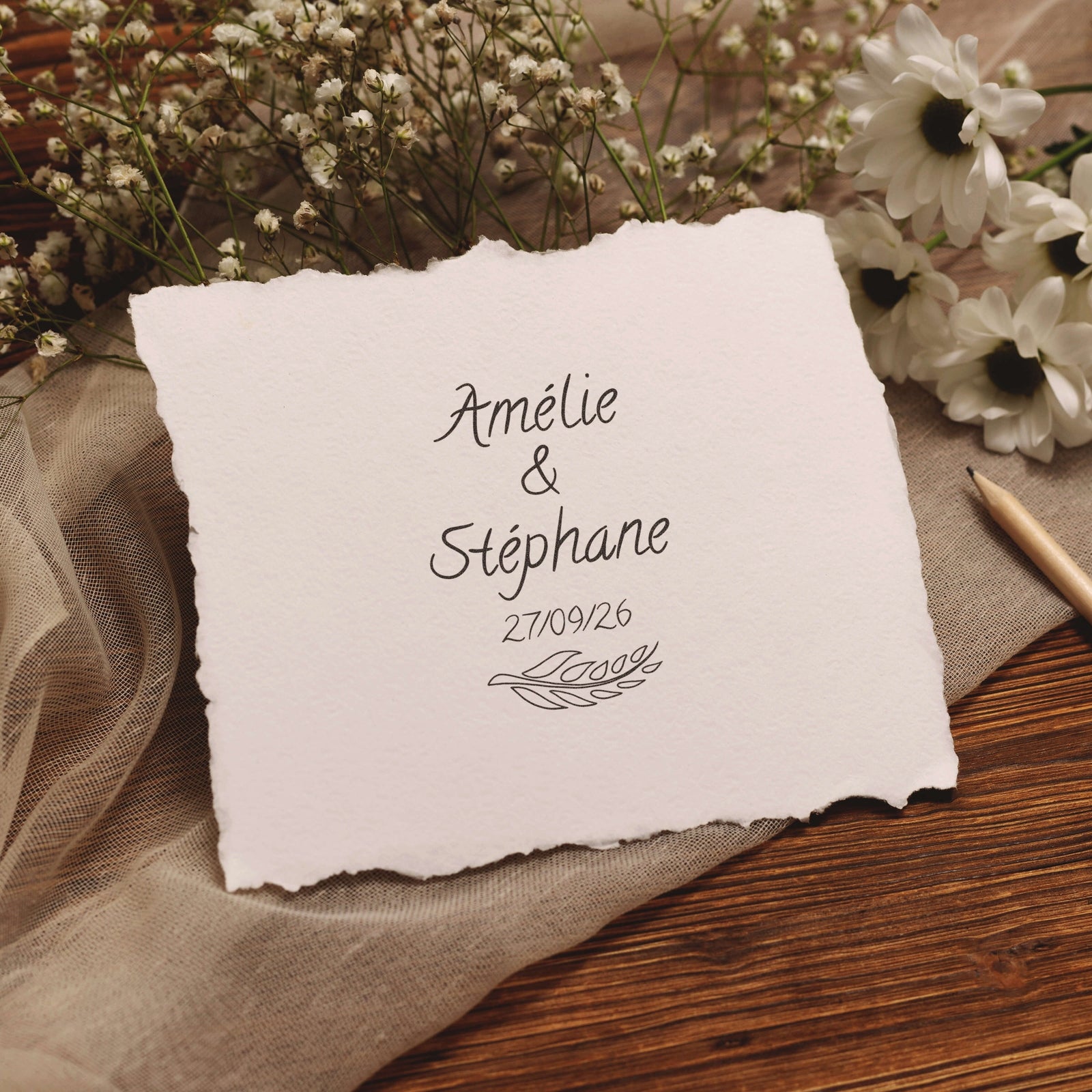 Celebrate your union with this wedding stamp featuring refined calligraphy, adorned with a delicate olive branch symbolizing peace and eternal love.
