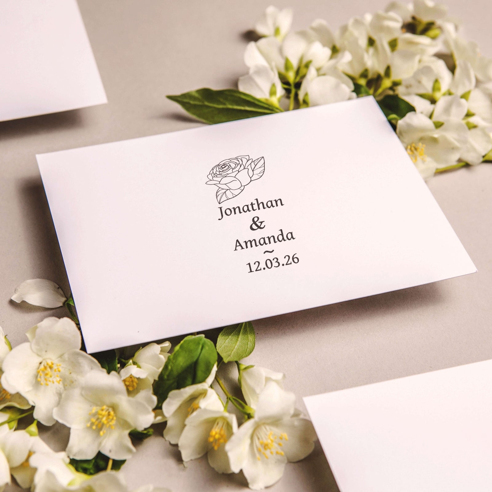 Celebrate your union with this customizable stamp design adorned with an elegant rose and your intertwined names.