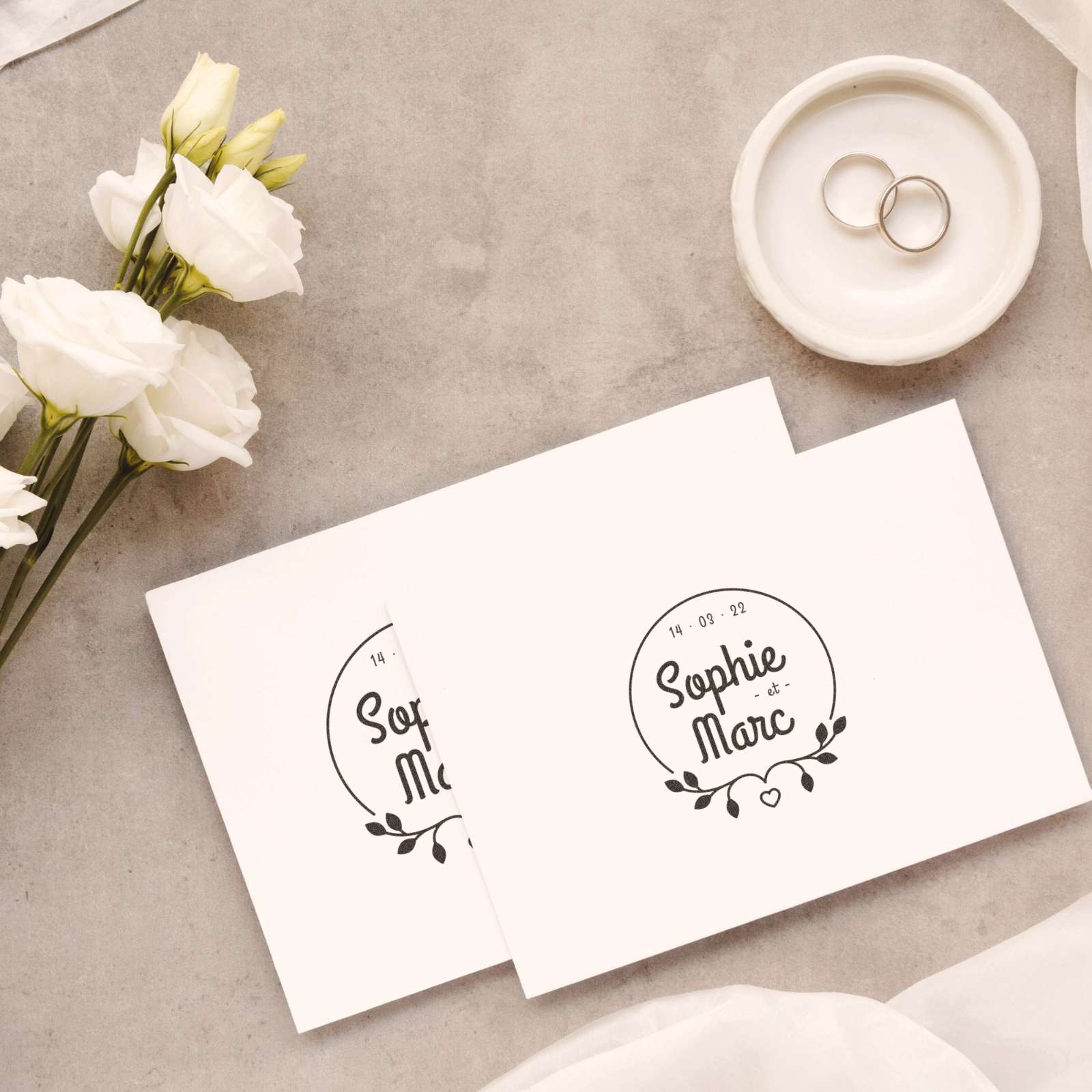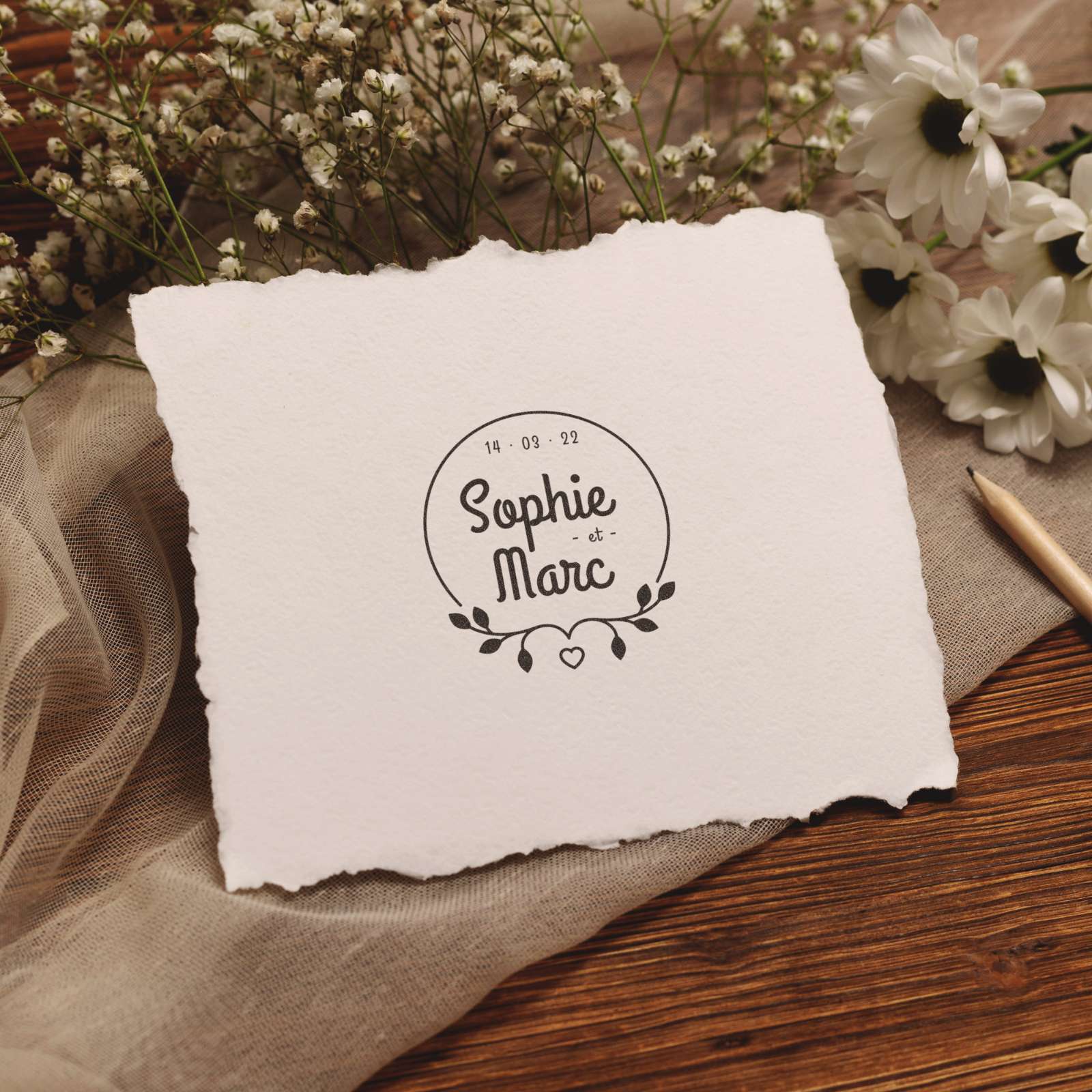Seal your union with elegance thanks to this minimalist wedding stamp with a refined round design, adorned with a delicate garland of foliage and a small symbolic heart.