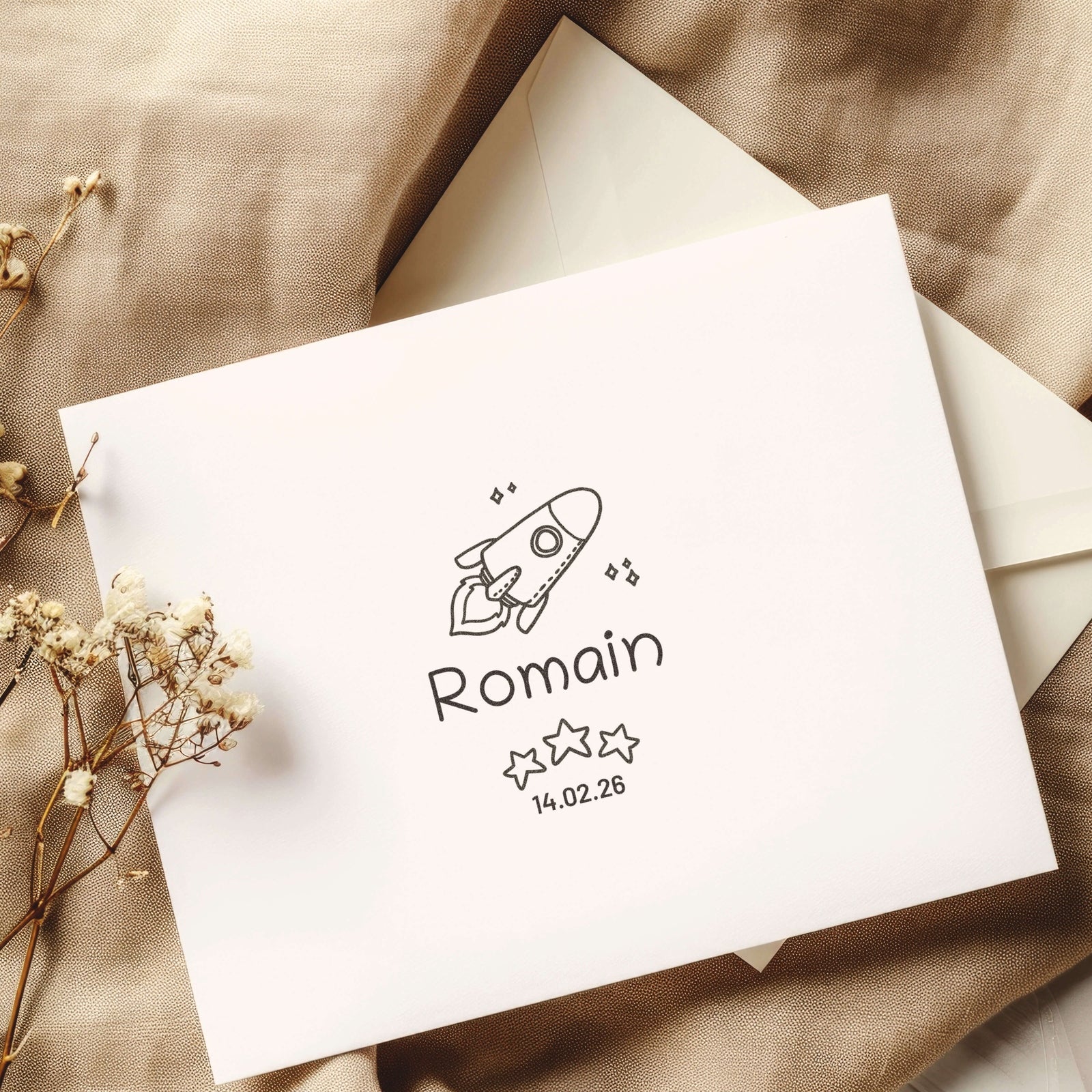 Celebrate the arrival of your little astronaut with this birth stamp featuring a minimalist and poetic rocket design.