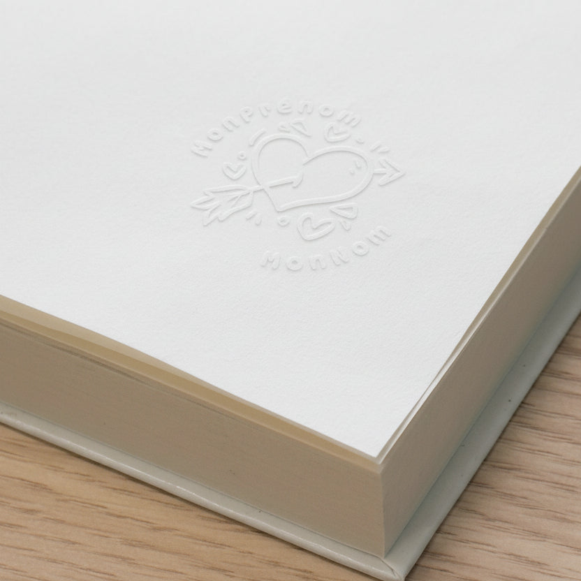 The dry stamp features a playfully drawn heart, around which you can add customizable text.