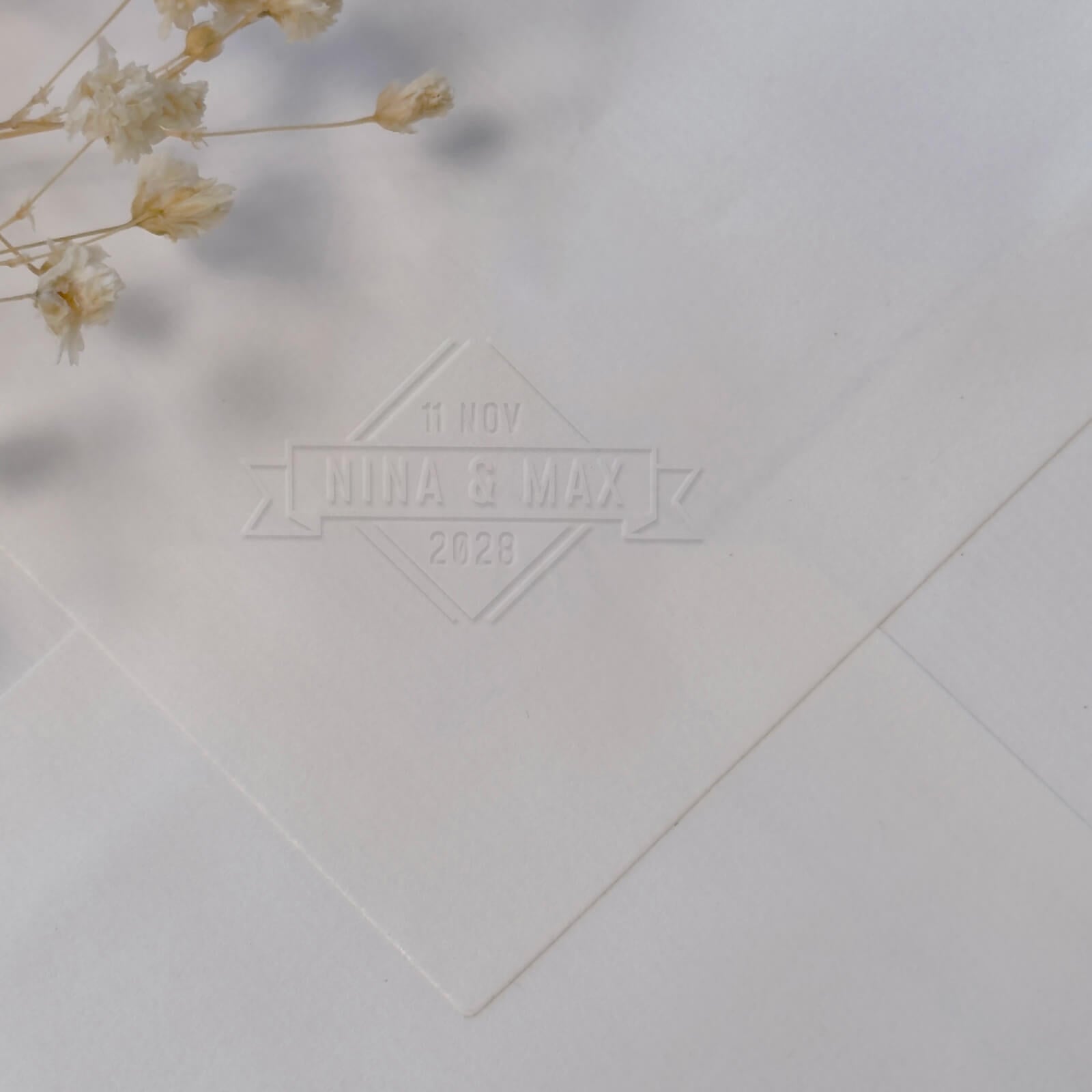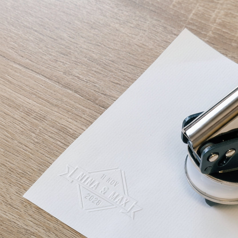 Imagine printing your wedding documents with a distinguished touch thanks to our embossed stamp design: Retro Wedding Embossed Stamp. This tool allows you to personalize your invitations, menus, or thank-you cards with discretion and style. A customizable retro monogram in the center is surrounded by ornate designs, adding a vintage look to each document.